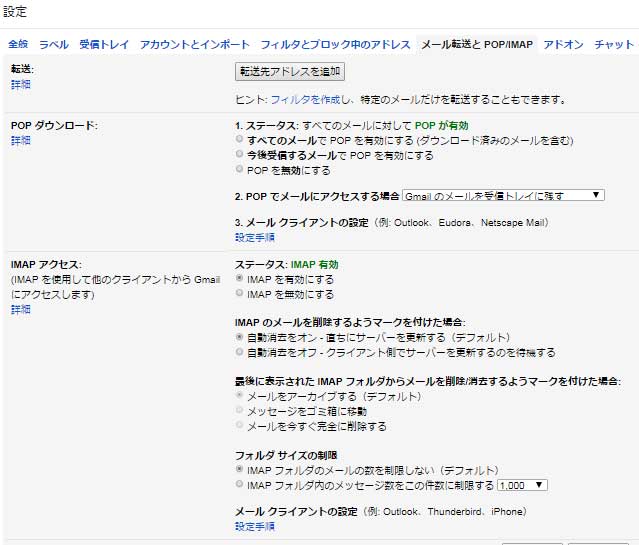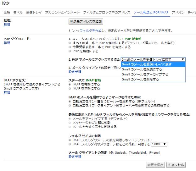 | 「メール転送と POP/IMAP 設定」タブ 「最後に表示されたIMAPフォルダからメールが消去されると:」 オプションで、「メールをGmailのゴミ箱に移動」を選択 |