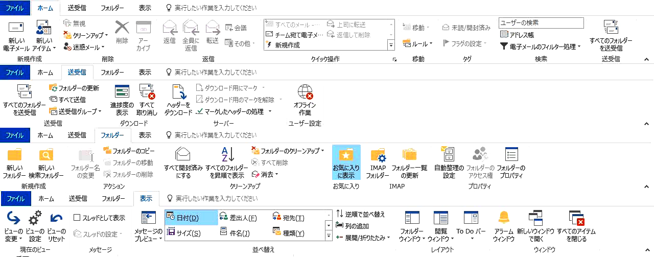 | 通常フォルダウインドウの場合 Ctrl + 6 お気に入りが消える Ctrl + 1再表示 フォルダウインドウ縮小化時の場合 [メール] ビューに切り替え Ctrl + 1 [フォルダー] ウィンドウの [フォルダー] 一覧に切り替え Ctrl + 6 |