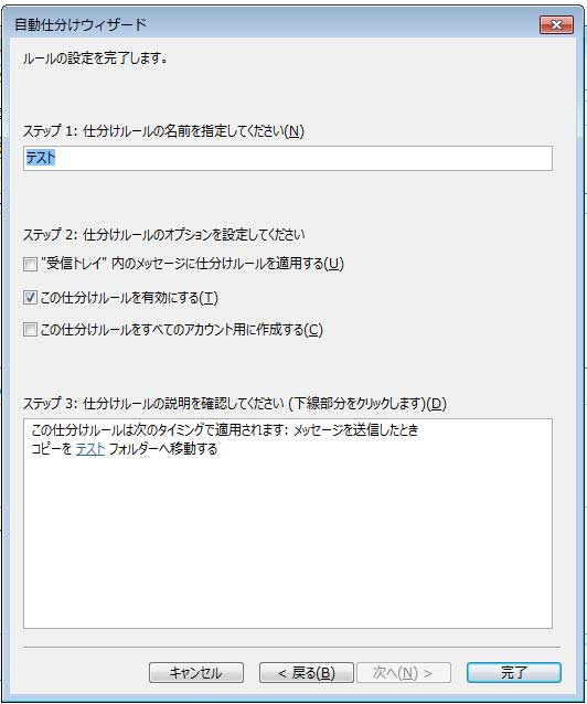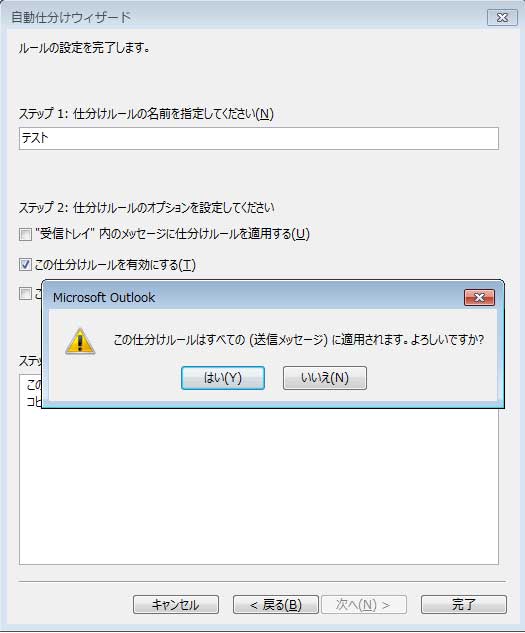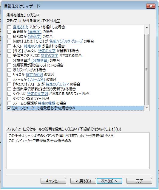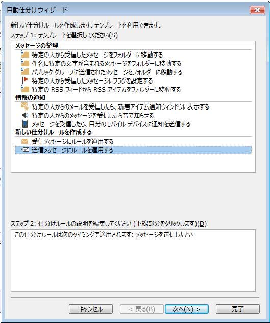 ホーム>ルール>仕分けルールと通知の管理>新しい仕分けルール 送信メッセージにルールを適用する>次へ |