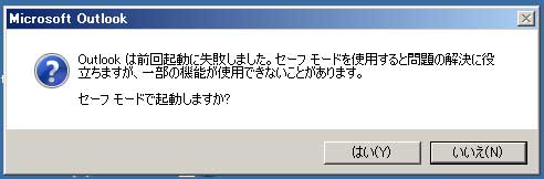 Oulookは前回起動に失敗しました。セーフモードを使用すると問題の解決に役立ちますが、一部の機能が使用できないことがあります。セーフモードで起動しますか?